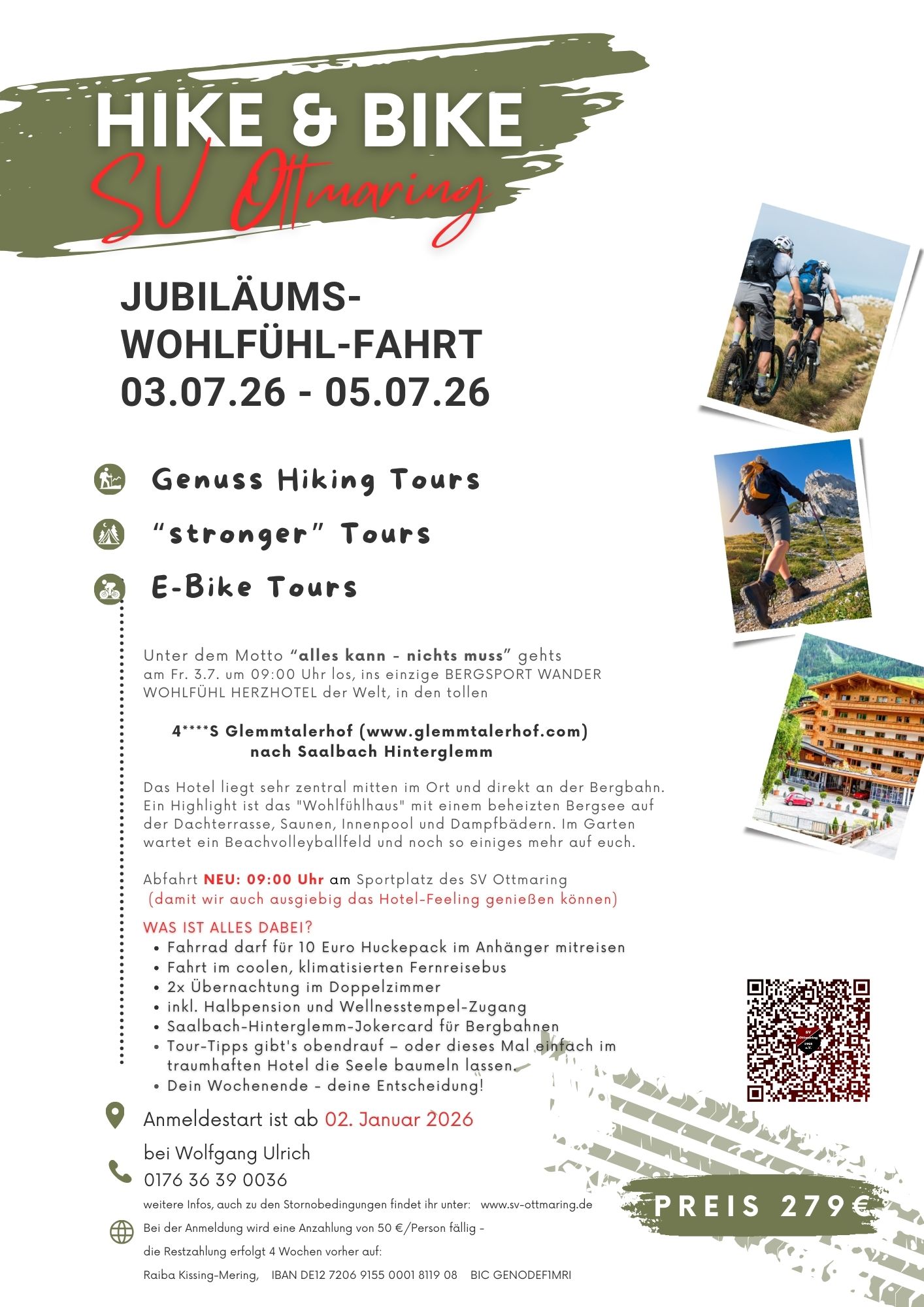 Bereits seit fünf Jahren zieht es den SV Ottmaring zu seiner jährlichen Wander- Bike- Fahrt in die Berge. 2026 startet der SV Ottmaring nun zu einer Jubiläums- Wohlfühlfahrt nach Saalbach Hinterglemm. Hier wird es an nichts fehlen. Egal ob Wandern, Biken oder einfach nur am beheizten Bergsee oder der Wellnesstempel die Seele baumeln lassen. Für jeden ist was dabei!