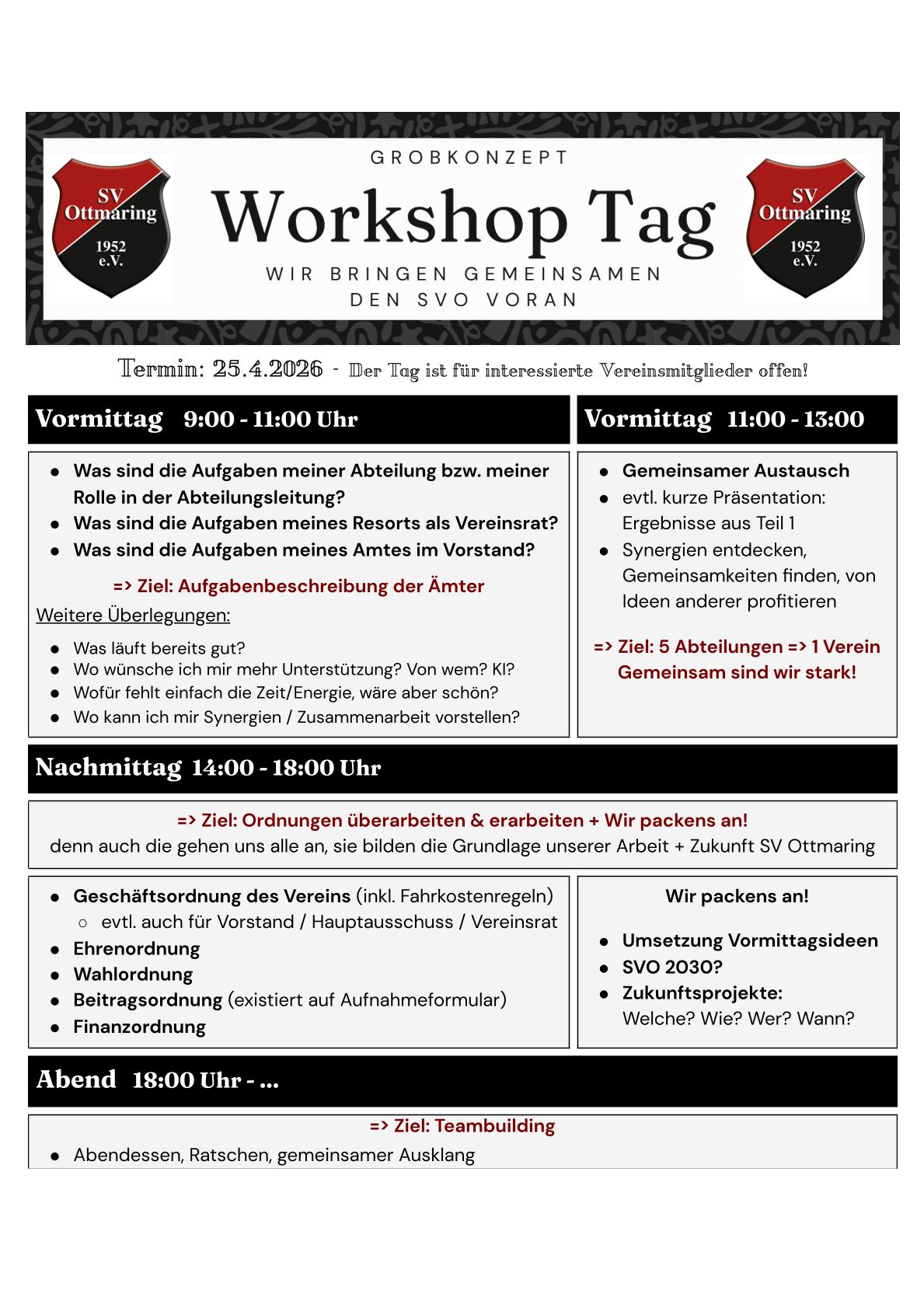Ihr möchtet gerne unseren Verein gemeinsam mit uns weiterentwickeln und eure Ideen einbringen? Dann kommt doch zu unserem Workshopday am 25.04.26 ins Sportheim. Während Vormittags in erster Linie die Aufgabenbeschreibungen unserer vorhanden und ggf. auch neuer, wünschenswerter Ämter auf dem Programm steht, geht es am Nachmittag um die Ideensammlung für unseren Sportverein der Zukunft. Abends lassen wir den Tag bei einem gemütlichem Abend und Come-Together ausklingen. Ihr könnt auch gerne nur einen Teil des Workshops mitmachen.