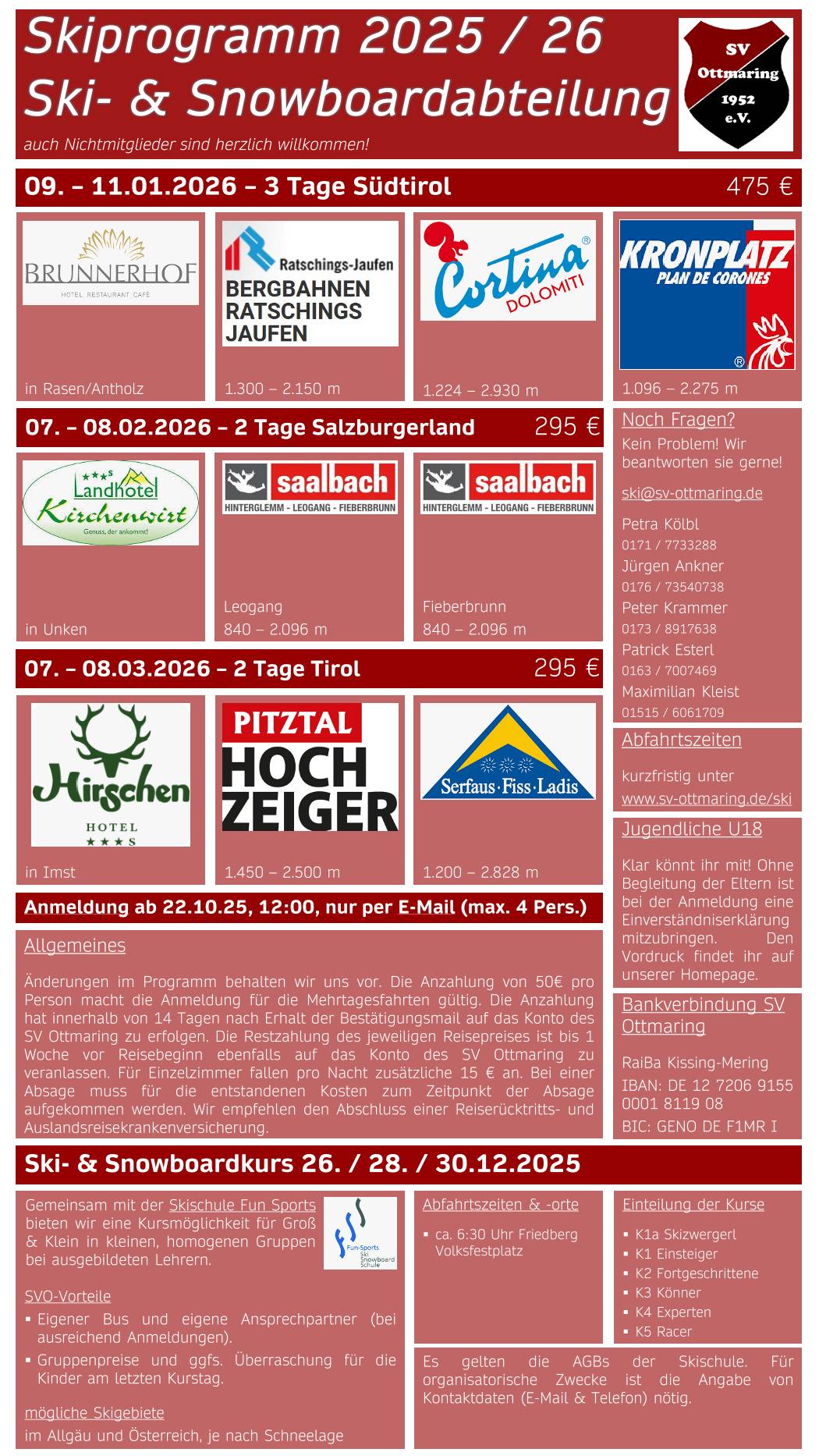 Die Anmeldung erfolgt auch in diesem Jahr wieder ausschließlich per E-Mail über Diese E-Mail-Adresse ist vor Spambots geschützt! Zur Anzeige muss JavaScript eingeschaltet sein!, über welche wir Euch jederzeit auch bei Fragen gerne zur Verfügung stehen. Startschuss ist der 22.10.25, 12:00 Uhr mittags. Alle zuvor eingegangenen Anmeldungen können leider nicht berücksichtigt werden. Die maximale Anmeldezahl beträgt vier Personen. Nach Erhalt einer Bestätigungsmail durch uns hat die Anzahlung in Höhe von 50€ pro Person und Fahrt innerhalb von 14 Tagen auf das Konto des SV Ottmaring zu erfolgen.